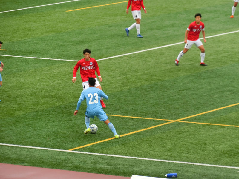 実のところ、試合を観戦できた前半も、そこまで集中して見られたわけではないので、細かい話ができる状況でもないのですが、中盤の左で出場していた23番シマブク・カズヨシに序盤は、サイドながら、ボールが集まり、起点になるような攻撃を見ることができ、ドリブル突破と、パス捌き両方をやるような役割まで1年生で任されているんだなと思っていたのですが、少しして、相手が右サイド中心に攻撃をしてくる部分での対応でシマブク・カズヨシが守備の対応をするために下がらざるを得ない(受け渡しとか考えると、他のポジションの選手がやるべきだなというところで、下がることなってしまっていたようにも見えましたが)ことで、攻撃に絡む数が激減していましたが、若干守備の対応が両チーム上手く行かない中で、新潟医療福祉大学の方が、チャンスの場面でしっかり決めることができる流れでリードを奪っていく流れで有利に試合を進めていました。