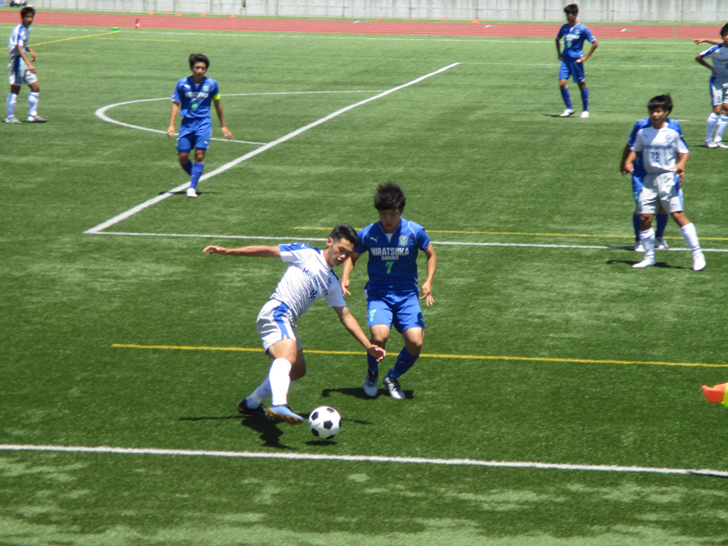 ただ、風上に立った前半を上手くクローズできず、前半ロスタイムに日大藤沢#9平田直輝が起点となっての崩しから#8植村洋斗の同点ゴールが決まり、後半開始早々には右からのアーリークロスにファーで#9平田直輝が頭で合せて逆転。