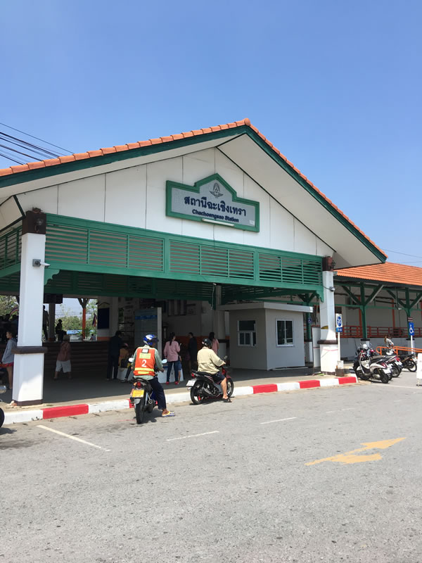 または、今回私は、行きは、バンコクのフアランポーン駅から電車でチャチュンサオ行きに乗りました。1時間に1本くらいですが、昼前後くらいであれば、チャチュンサオ終点の電車もポツポツありますので(今回は12:10発のチャチュンサオ終点の電車を利用)、降りる駅を気にする必要もありません。