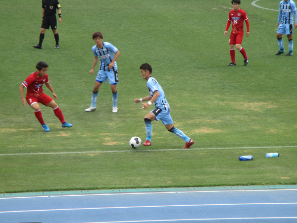 この日はピッチの縦方向に強い風が抜けるコンディションで、結果として前半はヴェルスパ、後半はFC大阪と風上に立ったチームが押し気味に進めました。しかし、前半のヴェルスパはグラウンダーでボールを走らせて、風には左右されない内容で押し込んでいたように思います。オーソドックスな繋ぎの組み立てから、ボランチの#10瓜生から精度の高い長短のパスが配球され、自分としては面白味を感じるサッカーです。