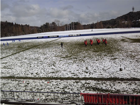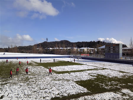 仙台から電車で利府へと移動し宮城サッカー場へ着いてピッチを見た瞬間「やっぱり・・・」という雪まみれのピッチ。最近関東で雪積もったのいつだったっけ?と思うくらい、雪と縁のない状況なので、おそらくジュニアユースの選手たちも、不慣れな環境だったのでしょう。雪の状況は写真を見ていただければお分かりかと思います。