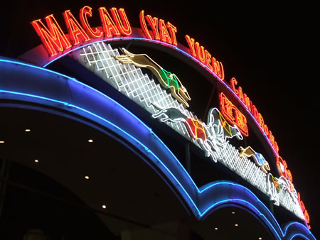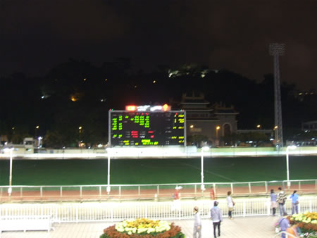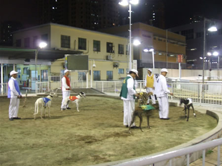 犬好きのブクメとしては、是非ここには来てみたかったということで、やってきました。左の写真は入り口の電飾です。犬が走ってます。真ん中はパドックですね。ここで犬の状態を見て賭けたい馬を決めます。賭け方は基本的に競馬と同じですが、競馬を日本でやらないブクメにとっては、それでも意味が半分くらいしか分からなかったのですが、パドックの犬をジーーーーーッと見つめて、妙に落ち着き払っている犬がいたので単勝で賭けたら、的中しましたよ!