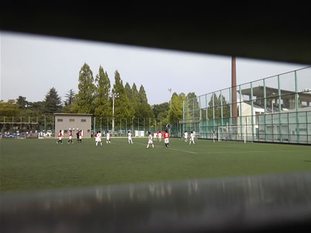 駒場スタジアムのサブグラウンドの金網の隙間から写真を撮ったらワイドテレビのようになりましたw