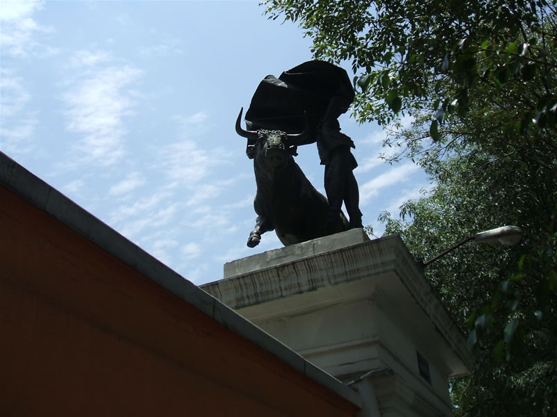 このスタジアムは、地下鉄サン・アントニオ駅(San Antonio)から近いようでしたので比較的スムーズに行け・・・ると思ったのですが、駅から出た瞬間に東西南北よくわからない交差点になっていて、行き先を示す看板があるわけでもなく、ちょっとてんぱりつつ、すぐに人に聞くのもどうかと思い、しばらく考えた結果決めた道を少し進んでみたら、スタジアム名の矢印のある看板発見!ということで、スムーズに進んで行きました。そして、2枚目の写真のスタジアムが見えてきて、あっさり発見!と思ったら、Azul(スペイン語で青)なのにスタジアムが赤過ぎると思い近付いてみると、なんかバッファローの像が・・・ということで、地図上ではスタジアムの奥にあるように書いてあった闘牛場(プラサ・メヒコ)が先に見つかりました。
