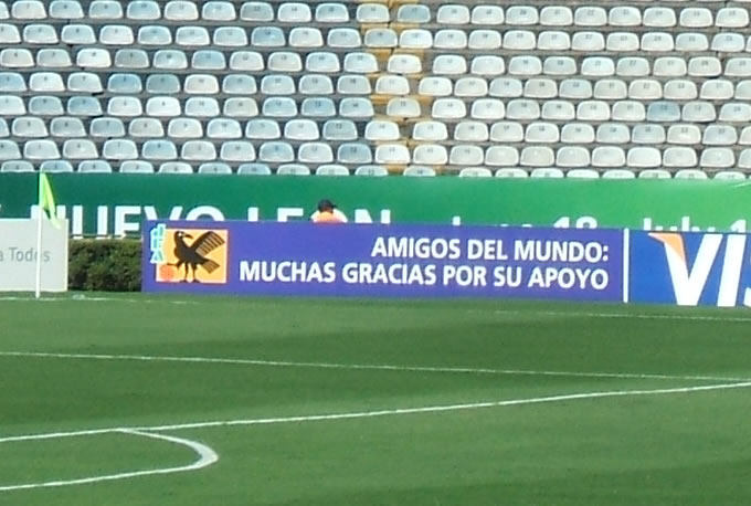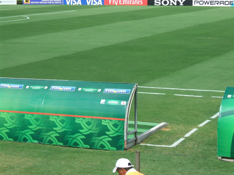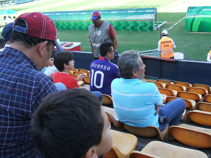 試合前にUANL大学の屋台のホットドックを食べました。ホットドッグ2つと飲み物で20ペソ(140円くらい)。さすがの学食プライスです。スタジアム横の露店ではホットドッグ1つが15ペソとかでした。今回はベンチ裏の席になったのでこういうアングルでスタジアムが見えます。グループステージの1,2試合を見たのが向こう側の席になります。こちらの席は、18時キックオフだとちょうど日影になり良い感じです。3枚目はベンチにJAPANと書いてありますねという写真。