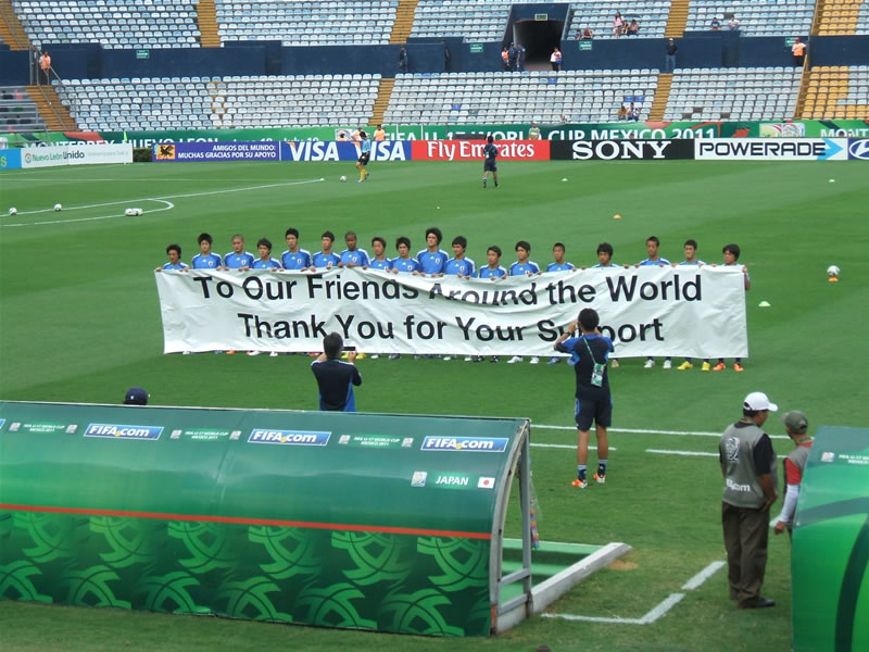 アップのために選手が入ってきて、アップして、毎試合行っている、震災の支援の感謝のバナーを持って歩いている写真。