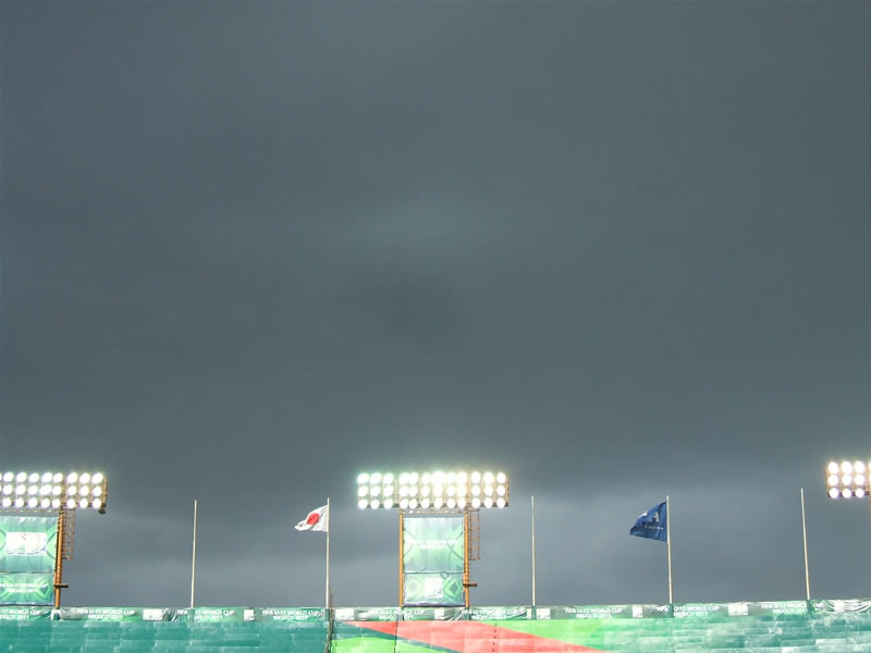 1枚目はハーフタイムに雲行きが怪しくなって来たよという写真。この後、大粒の雨が少し降ったりもしましたが、モレリアの時のような事態にはならず。2枚目は後半の試合中、ベンチ裏でアップする新井純平、高木大輔、鈴木武蔵。試合が気になってしょうがない様子です。3枚目は日本6-0で勝利!の写真。