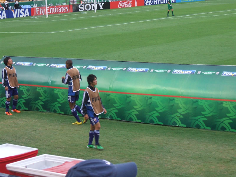 1枚目は、得点が入りベンチのメンバーも共に喜んでいるところ。2枚目は、ニュージーランドの控え選手のアップの場面ですが、膝をついている選手がケン・ヤマモト選手ですね。3枚目は、前半だけで4-0になりましたという写真。