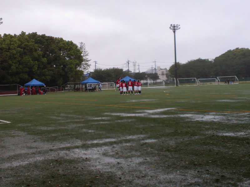 今日はアウェイでの試合となりますが、何しろ天候が凄かったのです。人工芝のグラウンドはところどころ水たまりでボールが止まる、雨も降ったりやんだり小雨だったり大雨だったり、とにかく条件は平等とは言え、かなり過酷なコンディションでの試合となりました。