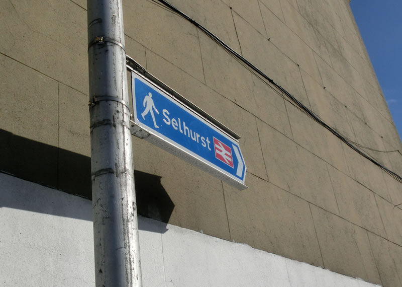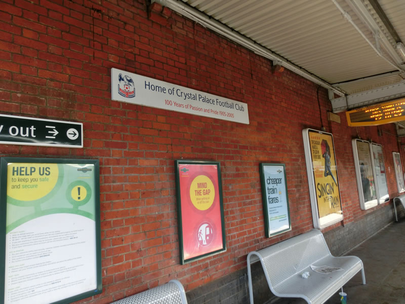 おまけの標識。クリスタル・パレスのスタジアムの坂の上の方にあるこの看板の通りにまっすぐ進んでも進んでも駅はないのです。 Selhaurst通りに出たら右折すべし!