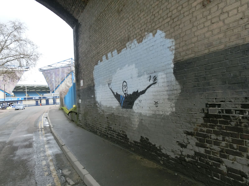 ただし、余裕は余裕なのですが、1枚目の写真のように高台にある駅、駅の表示の奥にスタジアムは見えているのですが、そのままその方向に出口はなく、駅の出口は、ま反対にあります。なので、見えるものの、いったん離れていき回り込んでいくような感じになるので、結果的に10分程度歩くことになります。それでも近いですね。2枚目は、その回り込んで最終的にスタジアムの入り口に入るために線路の下をくぐるトンネルの壁に書かれた落書きなのですが、落書きと言っては失礼なくらいかっこよく描かれていました。で、3枚目がミルウォールのスタジアム、ザ・デンです。