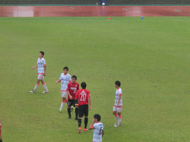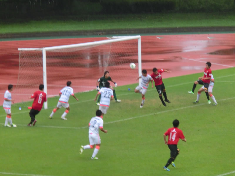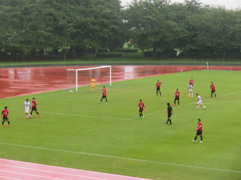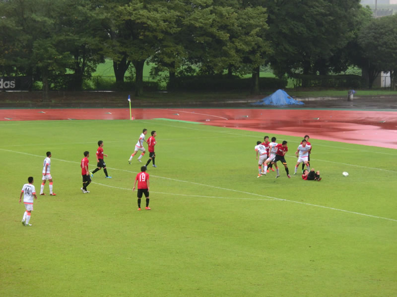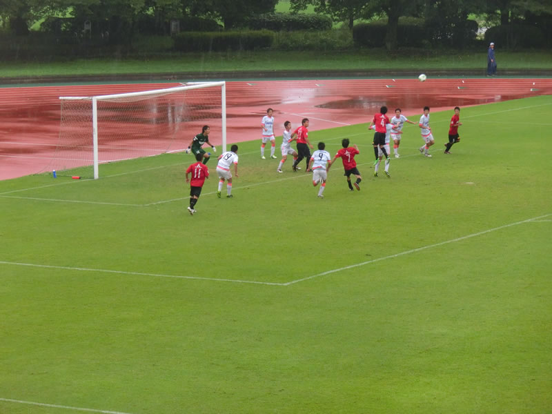 雨と言う状況を生かした形として、26分に19番橋岡和樹が狙ったのかミスキックかは分かりませんが、相手キーパーに向かってかなり高めのボールを蹴りこみます。普段であれば、なんなくキャッチされるところでしょうが、雨の影響もあってかこのボールを相手がキャッチできずにこぼれ、そのボールはゴール方向に向かって行ったのですが、相手選手がしっかりカバーしていたため、ここでの得点はならず。