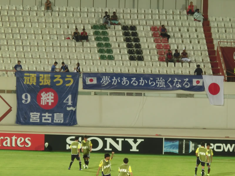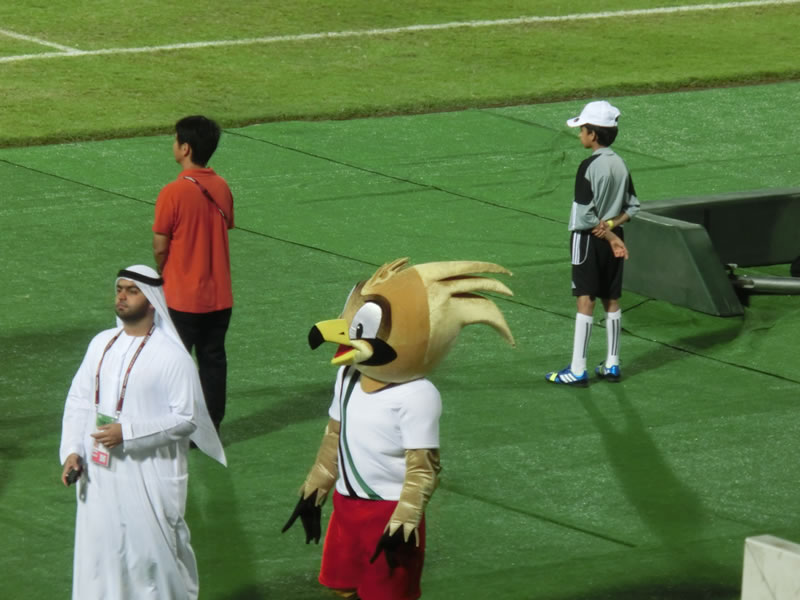 帰りがけに、スタジアム内の駐車場の入口のところの警備員さん(服装だけ見たら、怖いのに話出すと妙に人懐こいw)と話をしたのですが、「日本代表は、バルセロナみたいだ。アブダビ(決勝の開催地)まで行くだろう」と言ってくれました。調子の良いことを言う人が多いUAEの人たちなので、他のファンにも同じことを言っているかもしれませんが、嬉しい話ですよね。