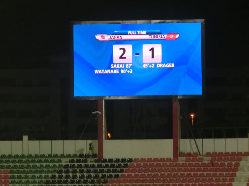 試合は、正直な感想から言うと観客席から見ていて、序盤から後半の途中くらいまでは、大幅にメンバーやポジションを変えたことで、コンビネーションがうまく行かないな~と感じた部分が多く、苦戦していて、さらにチュニジアの前線での動きが予想以上に細かいプレーと迫力を両方併せ持っていて、脅威に見える部分も多く、厳しい結果になる可能性もあると思っており、案の定というか、前半終了間際に豪快にミドルシュートを決められ、試合運びとしてもチュニジアが上回っているようにも見えたのですが、前半終了に電光掲示板に出たスタッツを見て、日本のポゼッションが確か70%近くあったと思うのですが、これを見て、驚き、更に後半に入り、チュニジアの選手が次々と足がつっていく姿を見て(キーパーが足をつっていたのは意味が分からなかったですがw)、最初は時間稼ぎかと思っていたのですが、なんかほとんどの選手が本当に足をつっていたらしく(交代枠を使い切って、足を引きずるようにプレーしている選手がいたりしたので・・)、思った以上に相手を消耗させていたんだな~と、驚き続けてみていました。