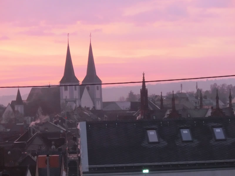 ホテルの部屋からの朝焼けの街並み、きれいですね。