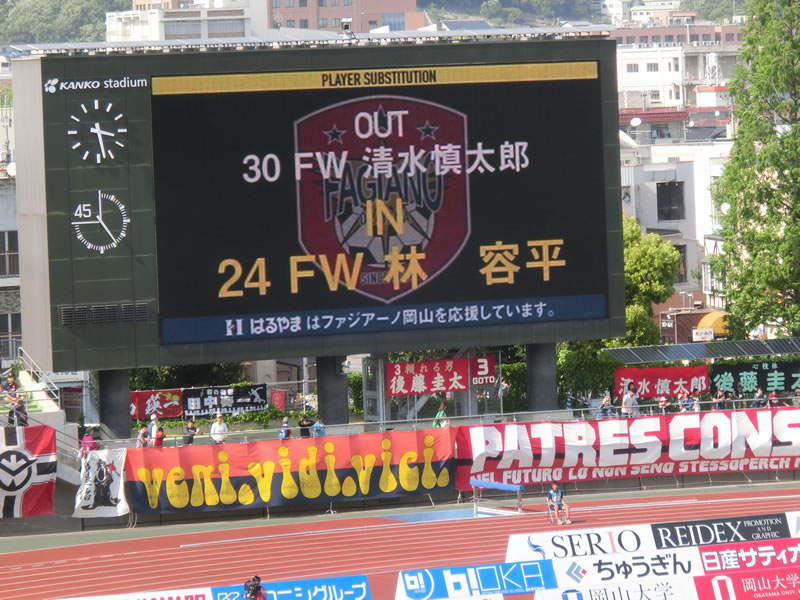 J2のファジアーノ岡山vsアビスパ福岡の試合も同日の午後に同会場で開催されるということを友人に聞かされるまで気が付いていなかったというのが、私の詰めの甘さというか、そんな正確な情報をくれ、私の無茶ぶりに付き合ってくれた友人と岡山で合流してこの日は、2試合を観戦する流れになりました。