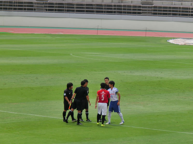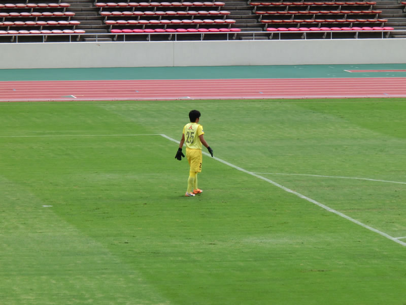 25番大川圭為の好セーブも何度かあり、決定的な場面で7番勝野瑛がギリギリでカバーして失点を免れるなどありましたが、19分に、気になっていたペナルティエリア外で相手にシュートコースを与えて詰め切れないところをコースを狙ったシュートを決められて1-1と同点に追いつかれます。