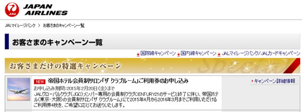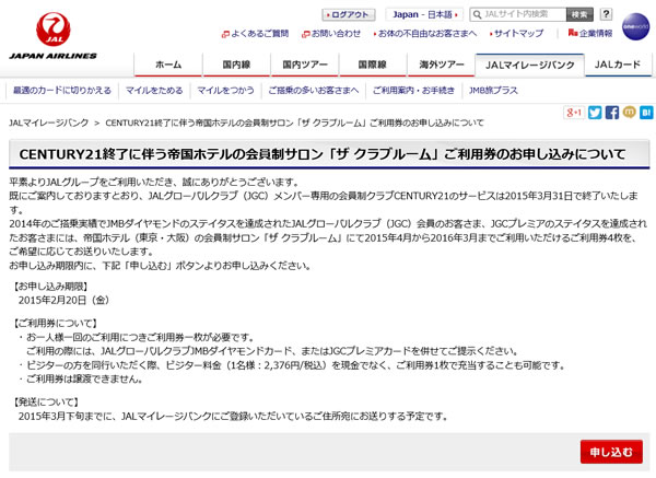 そんな、土曜日の深夜に、またふと思い立って、JALのホームページから、お客様のキャンペーン一覧をチェックすると、新しいキャンペーンが登場していました。無事に2014年もJGCプレミアまでのFLY ONポイントを達成することができたのですが、JGCプレミア以上の方向けに、これまでは、CENTURY21を利用できるという特典があったのですが、特に利用することもなかったのですが、それが今年度で終了となり、代わりに、帝国ホテルの会員制サロン「ザ クラブルーム」の利用券4枚がもらえるという特典に4月からは、変わるということで、その申込フォームができていました。