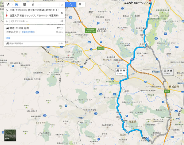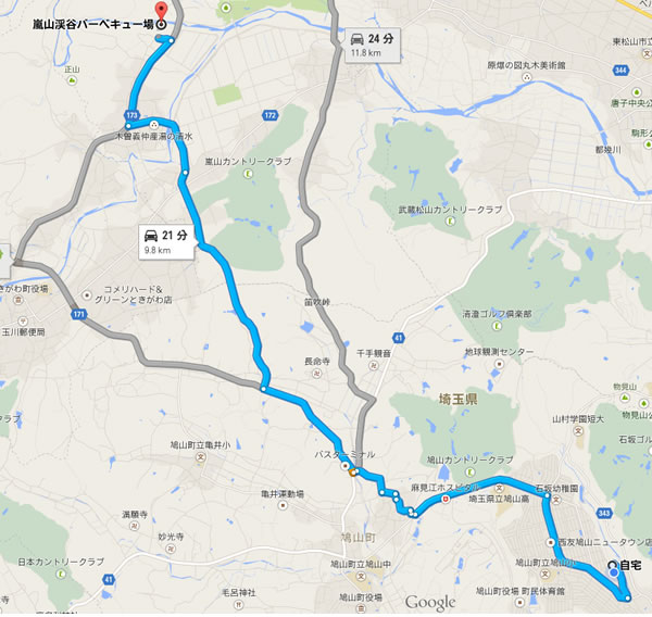 鳩山ニュータウンから車で行く場合は、上記のようなルートになります。大きめの道のみで行くルートもあるのですが、こういう大型連休の時は、その道も混むということで、このルートに関しては、上記の選択ルートだったり、それ以外にも混まない道のみで向かうこともできます。距離的にも、上記では、19.6キロとかになっていますが、混まない道で、もっと短い距離で行くことも可能です。