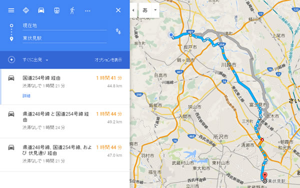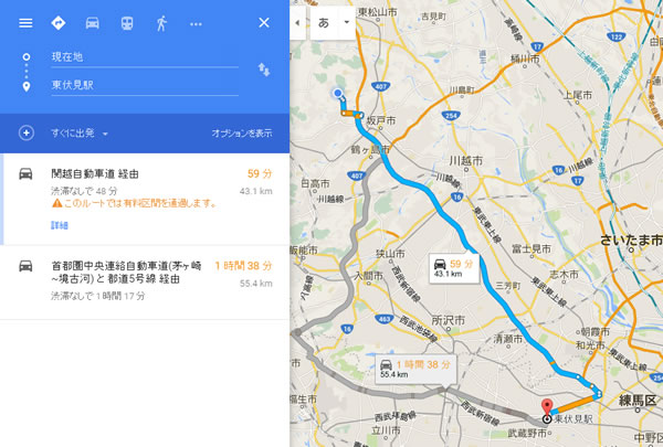 鳩山町からの距離が50km前後くらいの距離の時には、普段はあまり高速道路は利用しないのですが、平日の夕方~夜にかけて動くという時には、道によっては、渋滞がすごすぎて所要時間があまりにもかかると思う時には、調べて使うこともあります。