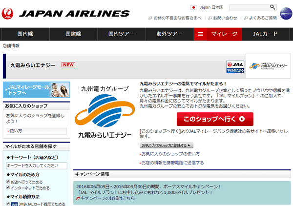 で、一応、検討する条件として、JALがそういうサービスを始めたら、検討しようかなと思っていたところで、JAL直接ではありませんが、九電みらいエナジーという九州の会社がJALとマイル提携をしたということで、思い切って変更してしまおうかなと思い、申し込みしてみました。