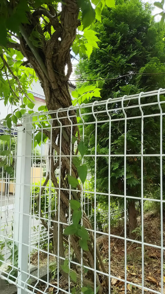 更に、写真をよく見るとわかるように、当初は、支柱を用意して、そこに巻き付くようにしていたと思われる支柱が、巻き付いて、折れて今は、巻き込まれていると言ったら良いでしょうか。