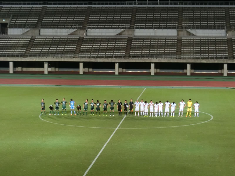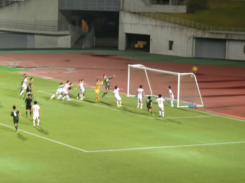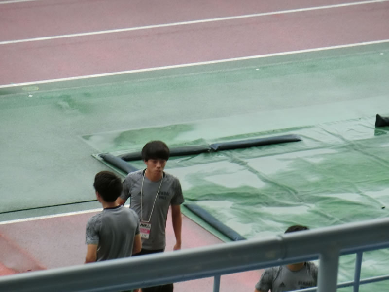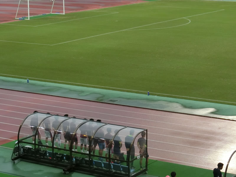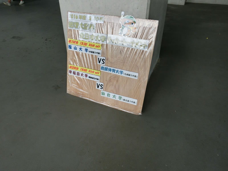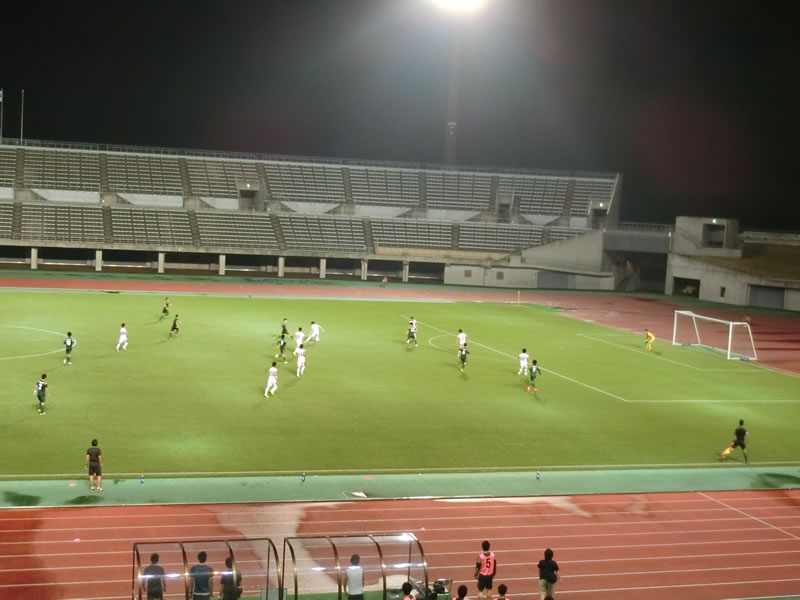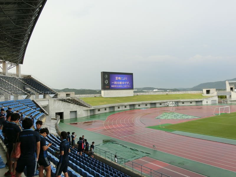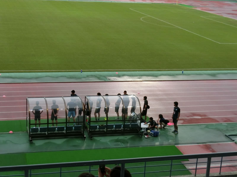 で、ちょうど第1試合の福山大学vs鹿屋体育大学が前半途中で雷で中断に入り、第2試合目安に、この会場に来るという方に同乗させてもらい、会場に着いたものの、第1試合が延期中。他会場でも同じようなことが起こっていて、完全に7日に延期になっていたり、第1試合開始が大幅に遅れて第2試合を20時キックオフにしたところもあったりでしたが、この会場は、第1試合が翌日へ延期になり、結局雷雲がなくなる予報の時間くらいの18:15から第2試合が開催されるという流れになりました。