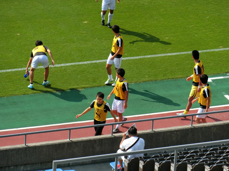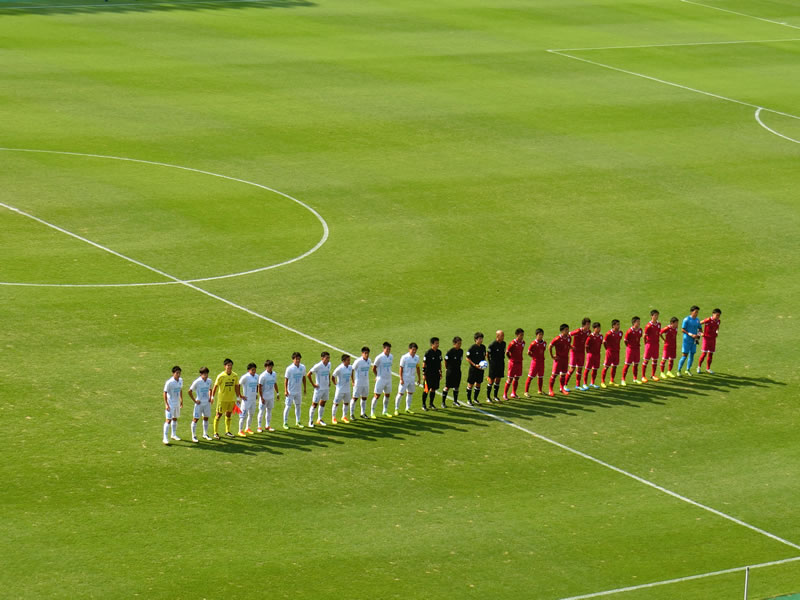 1回戦で観戦した仙台大学vs早稲田大学の試合に関しては、結果的に大荒れの天気で大雨が降った後ということで、比較的涼しく感じられる部分もあったのですが、今日観戦した試合は、本格的な暑さになりました。この大会は、中1日で90分で戦っていく大会になるため、ただでさえ疲労との戦いに加えて、暑さでの消耗も大変なものだと思います。ユースのクラセンでも、そのあたりを考慮して早い時間のキックオフだったりするのですが、総理大臣杯のこの時期の15:30キックオフというのは、ものすごく過酷だろうなと、ひしひしと伝わってくる試合でした。
