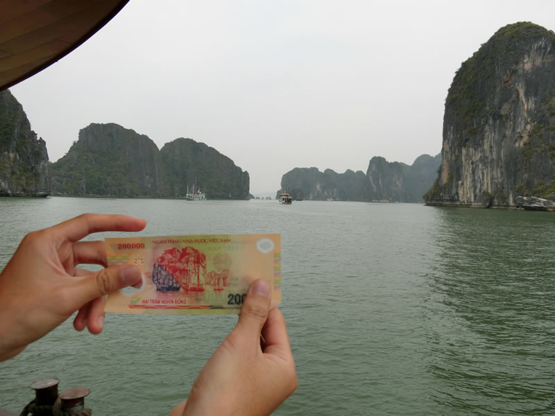 写真は、ベトナムのハノイの写真ですね。観光地として有名なハロン湾です。ベトナムの通貨の20万ドン(1000円相当くらい)の絵柄のデザインになった岩をなめるように写真を撮ったのですが、肝心な岩がだいぶ遠くてだいぶ小さいというオチだったりしますw