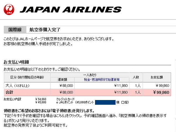 で、悩んだ挙句、その近辺の航空券で最も安かった上記の値段を貯まったマイルをe JALポイントに変えて、45000円分をe JALポイントで購入し、54860円をクレジットカードで支払うという形で気持ち、ダメージ小さめに購入しました。