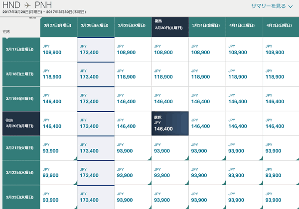 JALは、バンコク経由になるのですが、バンコク経由でプノンペンに行くというチケットに関しては、ダイナミックセイバーのFがあるくらい安いものも割と探せる・・・が、その後、3月中や4月上旬に日本に戻る便が大変。