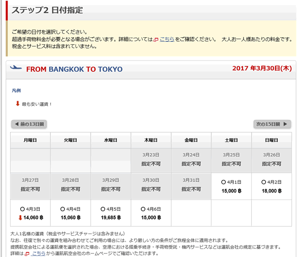 上記は、JALの海外発券のバンコク発での航空券で調べてみましたが、まず、3月31日まで指定不可(要するに満席とか、席が抑えられているとか、そういうことだと思います)で、4月1日からは購入可能なものの、この路線は、往復で安いと15000バーツ(5万円前後)の航空券があるものが、片道で日本円にすると5万円~6万円くらいの価格帯になってますね。要するに往復にすると10万円前後になるということ。