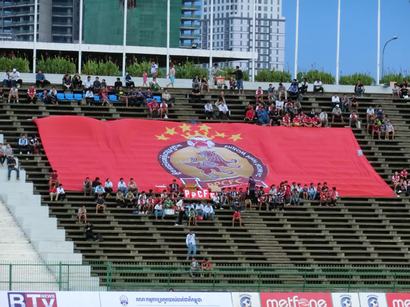 プノンペン・クラウンは、カンボジアリーグの中でも独自のホームスタジアムを持ち、サポーターも熱心に試合に足を運ぶチームとして知られています。上記は、オリンピックスタジアム開催されたアウェイゲームでしたが、ビッグフラッグと共にサポーターも駆けつけていました。