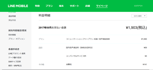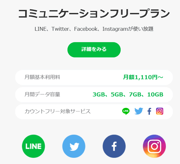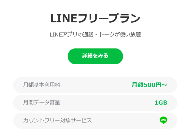 LINEの基本的な通信サービスが音声通話も含めてカウントされない(無料)で月額データ容量が1GBまでというプランなら月額500円~があったりするのですが、私が利用しているプランは、以下のプランになります。