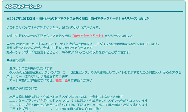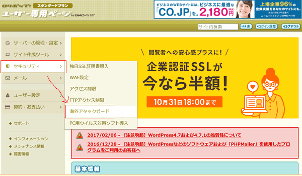 ログインして、セキュリティの項目を見てみると、見慣れぬ「海外アタックガード」という文字が。海外IPからのサイト管理画面へのアクセスを検知して不正アクセスを防ぐための機能として自動的に実装されたようです。