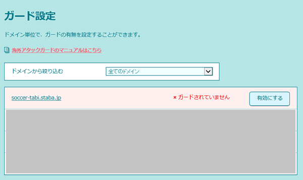 先ほどのセキュリティの項目から、「海外アタックガード」に入り、ページ下部のガード設定から、該当するドメインのガード設定を無効にするだけで解決です。上記は、既に無効にした状態ですので、ボタンは有効にするという表示になっています。