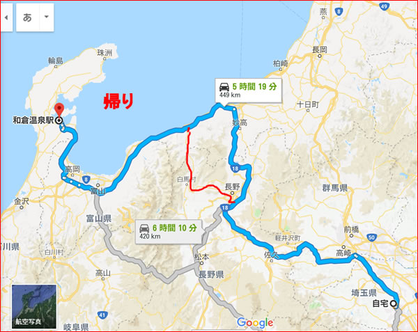 上記は、googleマップで自宅から、和倉温泉駅を一応の目的地にしたルート。これは、全て高速道路も有料道路も使うコースとして表示された候補ルートになります。
