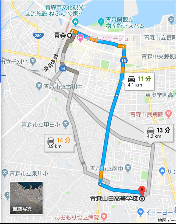 青森空港から青森山田高校への道のりをgoogleマップで調べて見ると、11.3キロで車で18分と出てきます。旅行も兼ねていたら、レンタカー借りて動けば、10時キックオフでもギリギリ間に合うかもしれませんね。タクシーを使ったらかなりの金額になりそう。