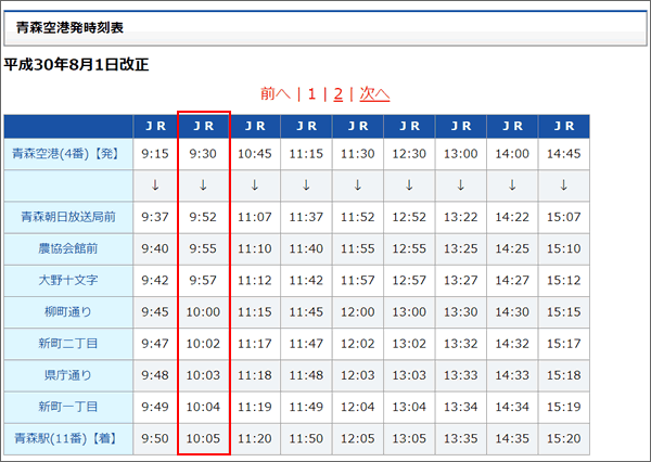 羽田発の青森空港行きの一番早い時間帯の便は、8時発で、9時15分に到着する便になります。キックオフ時間は、11時。さて、間に合うかなということで、そこからの移動を調べてみます。