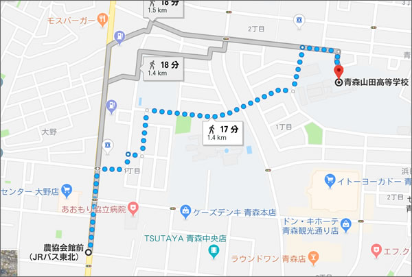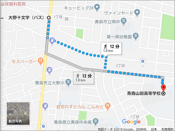 細かいバス停で青森山田高校への一番近いバス停を見つける