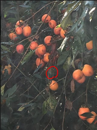 うちの庭にある柿です。ここに、メジロ(鳥)がいます。どこでしょう。正解は最後に。