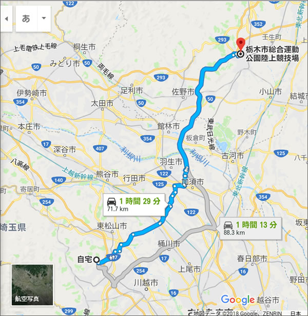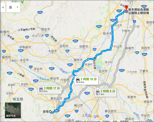 私が住んでいる埼玉県鳩山町からの場合は、栃木市陸上競技場であれば、70キロくらいで下道設定でも1時間30分かからないくらい。