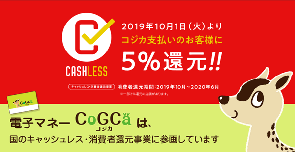 消費税増税に伴ってキャッシュレス支払いに対するポイント還元とかそんなニュースを見ていて、「関係あるところ身近にあるかな~、ないな~」と思っていたら、コモディイイダで導入されたコジカ(CoGCa)が普通に5%還元の対象になってましたw⇒(CoGCa導入していても、5%還元マークがある店舗のみが対象でコモディイイダは対象外とのこと・・・コメントで指摘していただきました摩天楼ボーイ様、ありがとうございます!)