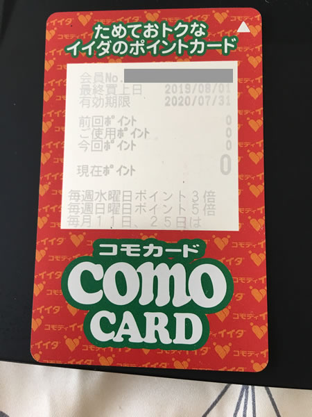 以前は、現金払いで上記のコモカード(COMO CARD)の提示でポイントがたまり500ポイントごとに500円分の商品券に交換して商品購入にも利用できるという仕組みでした。