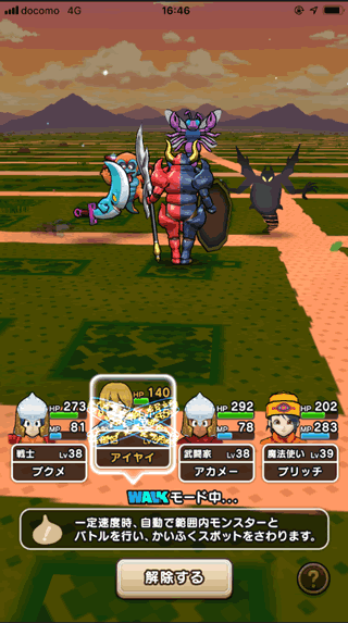 そして、もう一方は、ドラクエウォークを立ち上げたままWALKモードで放置(時々、通信エラーになっていると悲しいので、そこだけ気を付ける必要がありますが、あとは、信号とかの減速時に勝手にバトルして、瀕死になっても勝手に回復してくれますので、操作の必要はありません。)