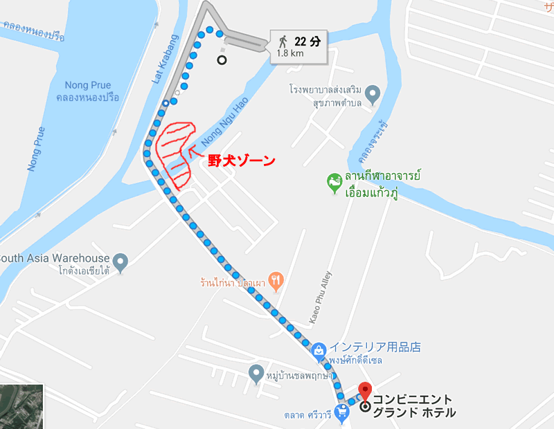 で、野犬ゾーンの話ですが、以前、チャチュンサオに足を運んだ時も野犬ゾーンに遭遇して怖い目に遭ったのですが、まさか、バンコクのしかも空港に近いエリアでも同じような風景に遭遇するとは思っていませんでした。しかも・・・野犬ではなく、飼われている犬らしいというオチもあるものの、それでも、大型犬が10匹以上一斉に吠えてきて、そのうち1,2匹が至近距離まで威嚇して吠えてくるという構図を想像してください。私は、犬好きですが、恐怖を感じましたw