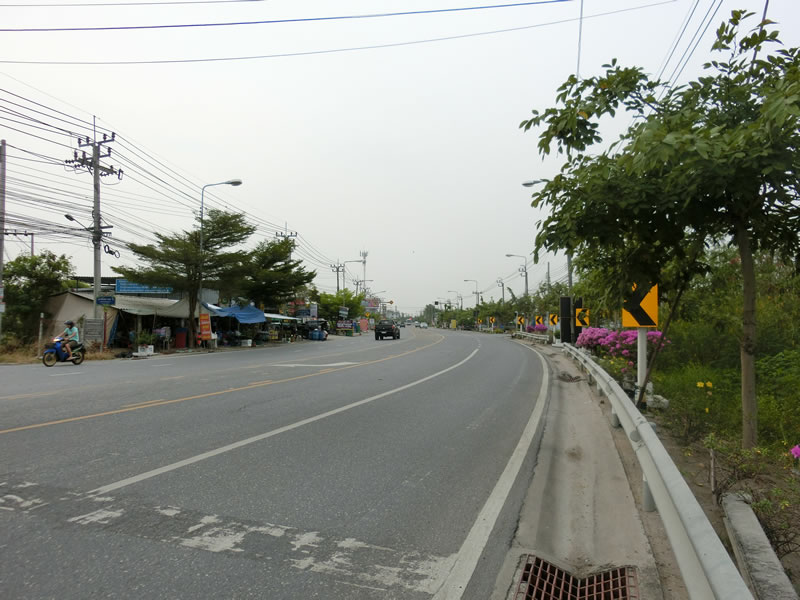 そして、もう一つお勧めしない点は、上の写真。バンコク郊外に抜けていくときに使われる大通りになるため、片側2車線を結構なスピードで車やバイク、大型バス、大型トラックが通り過ぎていきます。それであって、歩ける道は、そもそも歩く人を想定して作られていない窪みのある状態。
