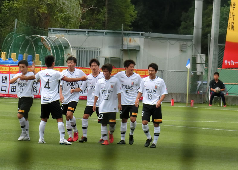 相手守備が硬く引っかかりそうな状況の中でしたが、浦和は恐れずにパス回しで打開を図る場面が多く見られ、7分には、13番堀井真海のポストから17番盛嘉伊人、4番玉城大志とテンポ良くパスをつなぐ流れから抜け出した10番山中惇希にパスを通して仕掛ける形を作ります。