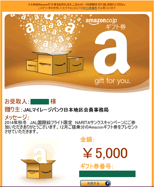 昨年12月のNARITAサンクスキャンペーン該当フィリピン行きの便利用のAmazonギフト届きました。【サッカーtabi】