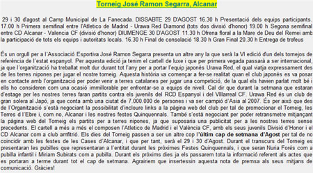 さて、ホセ・ラモン・セガラカップを前日に控えて得ていた情報は、タラゴナにあるアルカナルという場所、スタジアム名が「Estadi Municipal de la Fanecada」、逆にこれだけあれば調べられそうなものの検索しても詳細が全く分からず、さらにアルカナルには最寄駅がない。で、ヤフースペインとか使って調べてみたらVinaros Newsというサイトで大会のことを記事にしているのを唯一見つけまして。。。